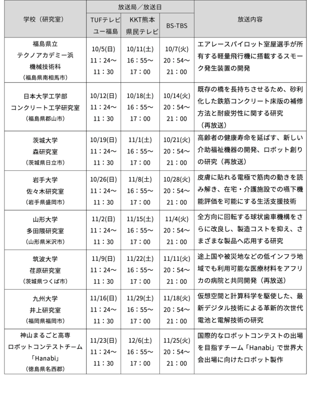 環境や資源、ウェルネスなどの社会の課題解決に向き合い、快適、安全、便利な未来を実現するために挑戦を続ける若者たちの姿を描きます。若者たちが真摯に研究に取り組む姿を通して、世界に誇る「日本の技術やモノづくり」の可能性を伝える番組です。東北から九州までの全国各地の8校の理系学生が登場し、ロボットやモビリティ、ヘルスケアなど、工学の分野の研究や開発で、世の中の課題解決に取り組む若者の姿を追いかけます。