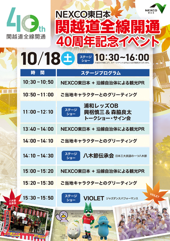本イベントは、日ごろから関越道をご利用いただいている沿線地域の皆さまへの感謝をお伝えするとともに、関越道の整備効果の理解を深めていただくことを目的に開催します。当日は、当社の事業PRに加え、浦和レッズOBによるトークショー&サイン会、沿線地域団体によるステージショー、沿線自治体による観光PR、ご当地キャラクターグリーティング、整備効果パネル展示など様々な企画を実施いたします。