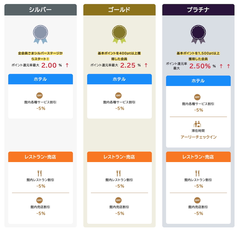 「GoTo Pass」は、全国180*を超える当社のホテルでご利用いただけるロイヤリティプログラムです。どなたでも入会可能で入会費・年会費は無料。当社はビジネスからリゾート・温泉までさまざまなスタイルの宿泊施設を展開しており、出張で利用した宿泊のポイントを休日にご家族とのリゾート旅行で使ったり、ライフスタイルに合わせてさまざまなシーンでポイントを貯めて使えるプログラムです。館内レストラン・売店が5% OFF*でご利用いただけたり、累積ポイントに応じたステージ(シルバー・ゴールド・プラチナの3段階)があり、ステージに応じた特典もご用意しています。また、ポイントが貯められるだけでなく、会員限定のメールマガジンで当社のイベントへのご招待などお得で貴重な情報も発信しています。*2025年11月1日時点