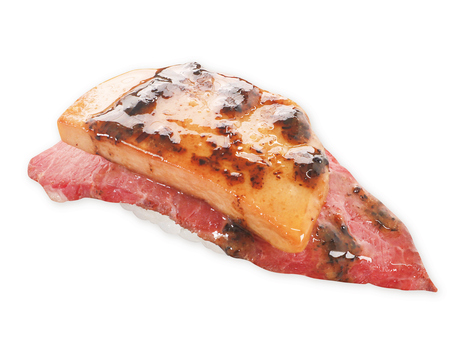 フレンチの王道“ロッシーニ”をお寿司で表現。赤身と脂のバランスが良いもも肉を使用し、低温でじっくり火入れした北海道牛のにぎりに、鶏レバーなどを使用した口どけなめらかで濃厚な味わいのフォアグラ風パテを乗せ、醤油を加えた香り高いトリュフソースをかけました。贅沢な味わいが口の中で広がります。