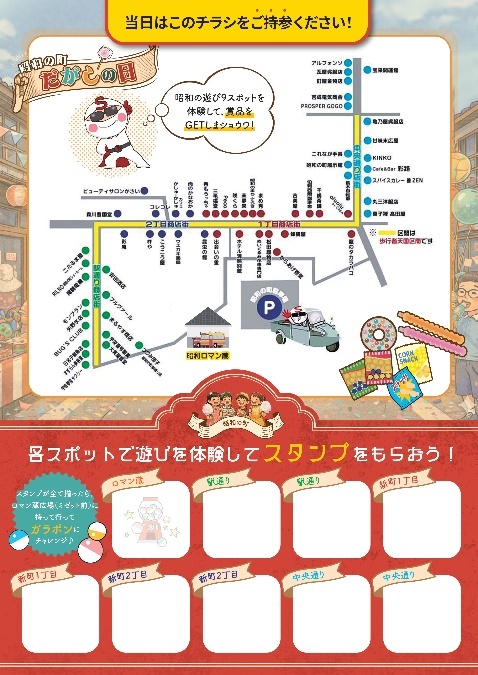 商店街にある全9か所の遊びスポットを攻略して駄菓子ゲット&全部クリアでガラポンに挑戦!