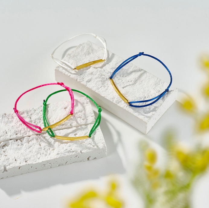 カラフルなコード紐と高級感のあるゴールドプレートで様々なコーディネートにマッチする腕用チャリティーアクセサリー。ワンポイントで日常を華やかに彩りながら、血流をケアし、腕のコリ改善に寄与します。長時間のデスクワークで腕のコリが気になる方にぴったりの商品です。